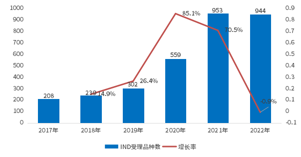 图1 2017-2022年CDE受理的1类新药IND品种数 数据来源:NMPA年度药品审评报告、药智数据,药智咨询整理