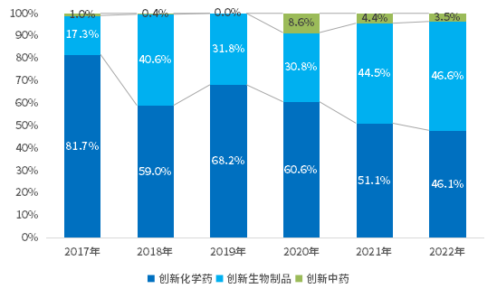 图2 2017-2022年我国1类新药IND药物类型占比情况 数据来源:CDE、药智数据,药智咨询整理