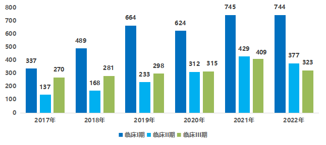 图3 2017-2022年我国1类化药和1类生物制品临床试验分期情况 数据来源:长江证券、药智数据,药智咨询整理