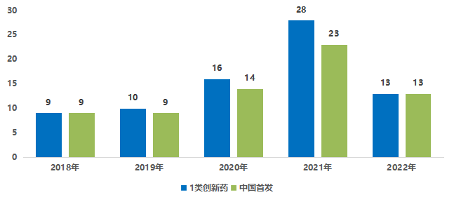图4 2018-2022年中国上市的1类化药和生物药上市数以及中国首发情况 数据来源:NMPA年度药品审评报告、药智数据,药智咨询整理