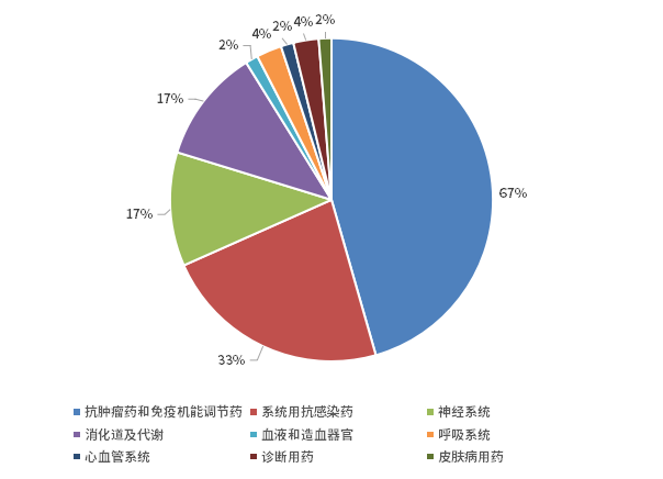 2018-2022年中国首发上市的化药和生物药中,抗肿瘤药和免疫机能调节药占比最大(67%),是目前医药研发的热点领域,其次是系统用抗感染药占比为33%。2018-2022年累计,化学药品占比达到75%,生物药品占比25%。