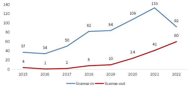 图10 2015-2022年license-in和license-out交易数量趋势 数据来源:美柏资本,药智咨询整理