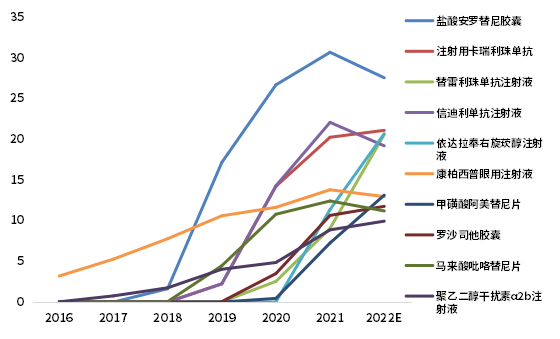 图12 2016年-2022E上市的1类创新药医院销售曲线图(TOP10)说明:该图选取2022年销售额TOP10的药品,未包括TOP10以外的药品;数据来源:药智数据,药智咨询整理