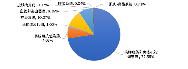 从图13可以清晰看到,近年来我国新药批准生产最多的是抗肿瘤药和免疫机能调节药,占比超过一半(占比72.55%),其次是神经系统药(占比10.07%);抗肿瘤药一直是新药研发的热点。新药上市后可以给原研药企在专利保护期带来巨大的收益,在专利期后由于抗肿瘤类新药有明显的技术壁垒和较高的仿制成本,仿制药企业对于此类药物会有更慎重的考虑。