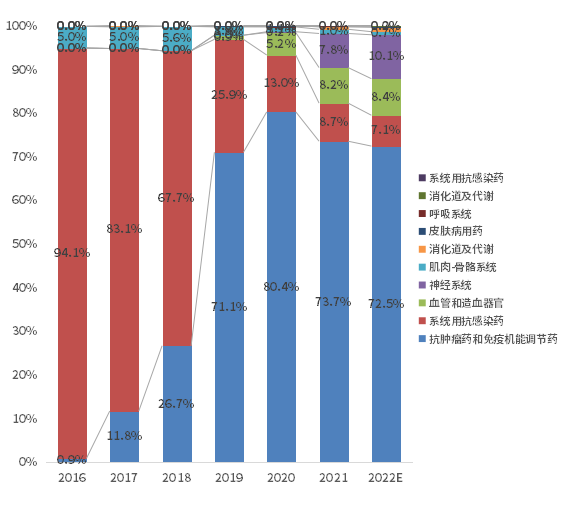 根据治疗领域分类,将2016-2022.6年批准上市的新药进行分类计算,销售额增长趋势如图14所示。其中抗肿瘤药和免疫机能调节药分类的销售额是增长最迅速的,抗感染领域的销售份额近年快速下降,血管和造血器官领域的创新药市场占比从2020年开始逐渐增大。
