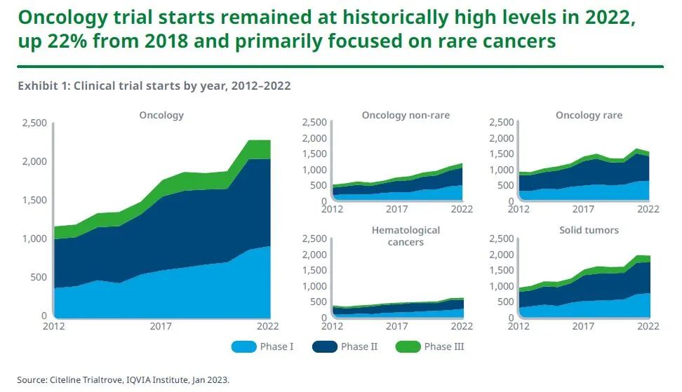 2022年启动的肿瘤临床试验数目仍然保持在历史高位,较2018年增长了22%,并主要集中在罕见癌症。