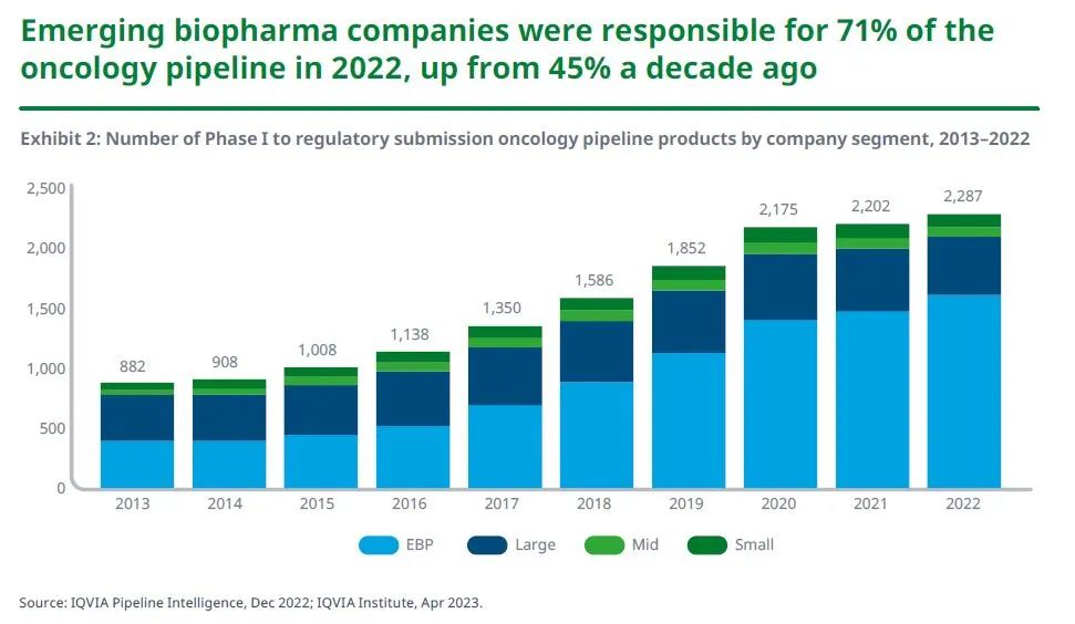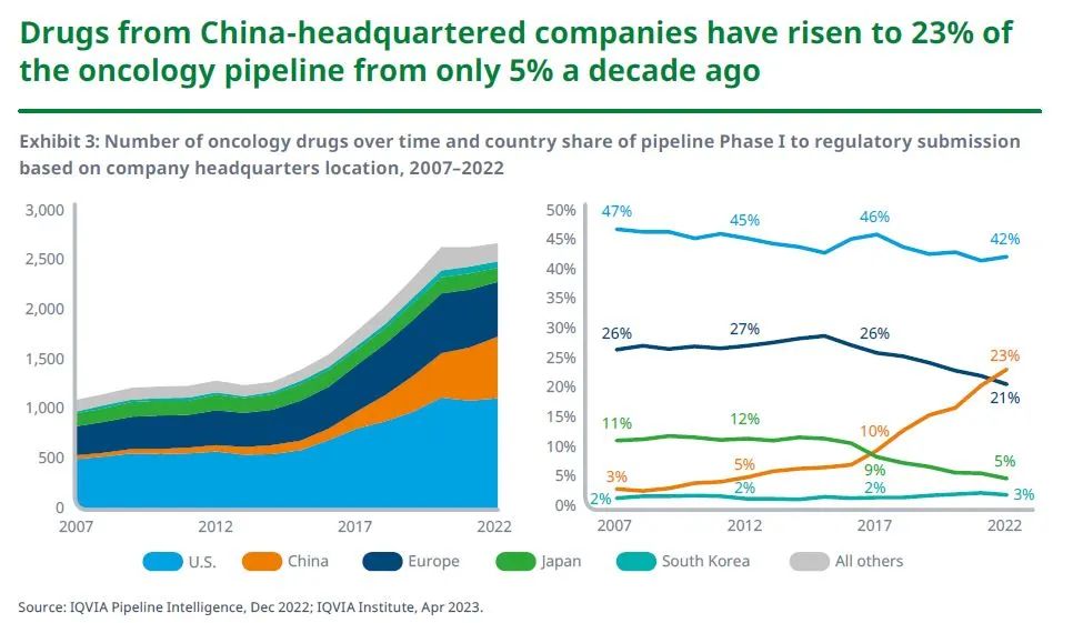 2022年,总部在中国的公司开发的在研产品占肿瘤研发管线的23%,高于五年前的10%和2007年的3%,首次超过欧洲。这些公司活跃的肿瘤管线在过去五年中的增长超1倍,预示其未来将在全球新产品的开发中发挥重要作用。