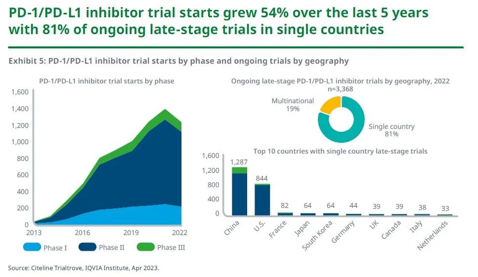 在过去的十年中,肿瘤研发管线逐渐聚焦于靶向药物,具有创新作用机制的新治疗模式发展迅速。以PD-1/PD-L1抑制剂药物为例,尽管2022年管线数有所回落,但近五年启动的相关临床试验数量增幅仍高达54%。大部分进行中的PD-1/PD-L1晚期药物临床试验集中在单个国家,且大多位于中国,这意味着,这些正在试验中的药物不一定面向国际市场。同时,双特异性抗体疗法,抗体偶联药物,以及包含细胞疗法、RNA癌症疫苗在内的新一代生物疗法增长迅猛。