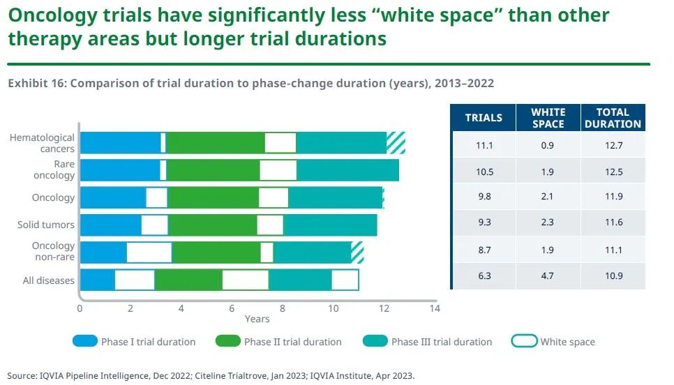 2015年以来,肿瘤研发的综合成功率一直呈下降趋势,在2022年降至3.5%。从符合条件的患者人数、临床试验终点、研究中心、国家和临床对象数量方面来看,肿瘤药试验相较其他疾病领域复杂得多。并且,肿瘤药试验的“空白期”(即临床试验持续时间与试验阶段之间的时间差)远小于其他治疗领域,但试验持续时间更长。虽然罕见癌症的生产力较高,但综合其成功率、复杂性和持续时间来看,肿瘤药研究的整体生产力是所有治疗领域中最低的。