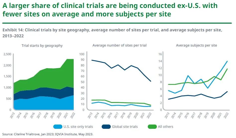 值得一提的是,随着中国的临床试验活动的增加,越来越多的临床试验在美国以外的地区进行。尽管各地区的平均研究中心数量较少,但每个研究中心的受试者数量不断上升。2022年,非美国的试验占57%,高于十年前的42%;同年,仅在中国国内进行的试验就占非美国试验的57%,高于2013年的12%,体现出中国试验活动的增长。