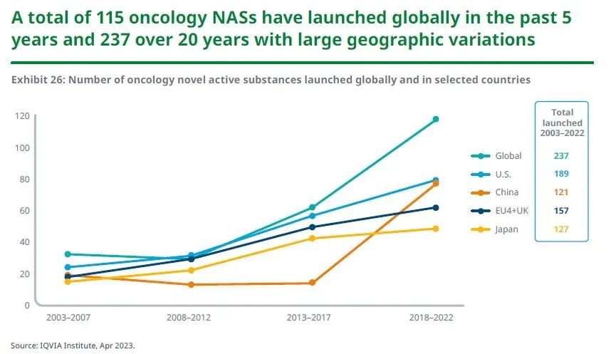 2022年,全球共有21种肿瘤新活性物质(NAS)上市,低于2021年上市35种的记录。在过去五年中,全球共有115种新活性物质上市,自2003年以来共计237种。虽然并不是在所有国家都能买到这些药物,但大多数国家都取得了一些重要的免疫肿瘤学突破,且使用精准生物标志物已经成为多种肿瘤的标准疗法。