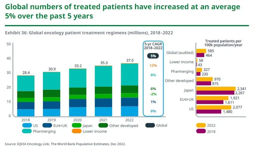 全球接受治疗的癌症患者数量在过去五年中平均增长了5%,并且随着新型药物的使用范围进一步扩大,预计数据在未来五年会加速增长。即便如此,各国为患者提供新型癌症疗法的进程各不相同,包括生物标志物检测率、新型疗法的采用程度以及提供最先进疗法的基础设施能力。此外,许多新型肿瘤药物在过去十年中展现出显著的临床价值,但各国在药物的获取和使用方面存在很大差异。