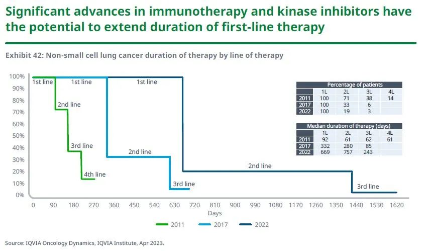 近五年,非小细胞肺癌的疗法开始转变,将PD-1/PD-L1抑制剂和激酶抑制剂作为标准疗法,促使一线治疗法的中位持续时间延长了近一年。近年来,随着新型疗法更广泛的应用,妇科癌症和多发性骨髓瘤药物也取得了进展,患者治疗的有效性得到改善。新一代生物疗法,包括细胞和基因疗法,在癌症治疗中的应用持续增长。