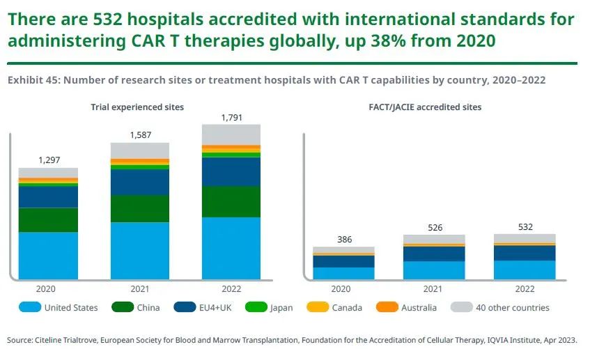 自2020年以来,全球有经验的CAR-T细胞疗法研究中心不断增加,在2022年达到1791个,其中有360个位于中国——大量CAR-T疗法的创新研究正在中国发生。同时,获得认证的研究中心数量从2020年的386个增长到2022年的532个,这意味着更多的CAR-T细胞疗法获批,且患者获得治疗的机会也在增加。然而,由于其地理位置和产品供应的问题,那些不具长途旅行条件的患者仍无法获得治疗。