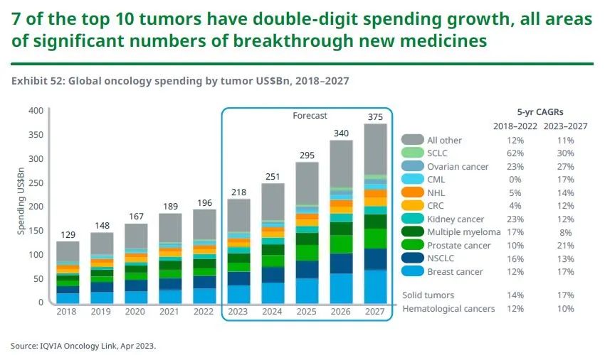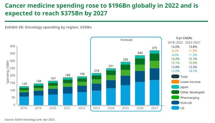 2022年全球肿瘤药物支出达到1960亿美元,预计在2027年将达到3750亿美元,支出增长由持续的创新所驱动,同时又因主要市场对生物仿制药的采用而部分抵消。美国仍然是全球最大的市场,欧盟四国和英国紧随其后。