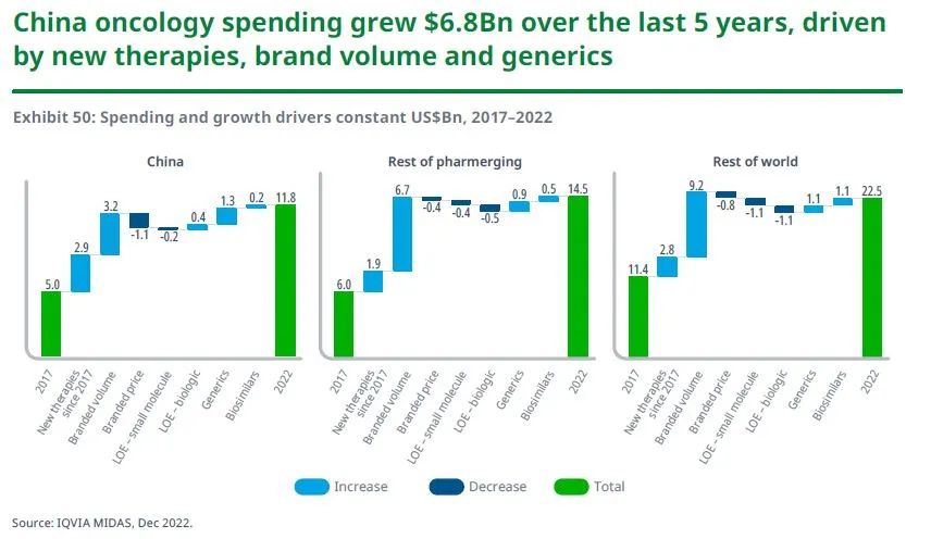 过去五年里,中国在肿瘤领域的支出增长了68亿美元,这主要是由于新疗法的普及和品牌数量的增加,但仍有部分被药品控费抵消。在全球范围内,因新药和新型疗法向早期治疗线转移,包括PD-1/PD-L1抑制剂,十大肿瘤治疗领域中有七种在过去五年中而实现了两位数的支出增长。