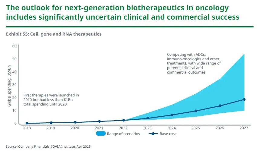 肿瘤新一代生物疗法的强大管线在临床和商业上拥有巨大潜力,但也存在相当的不确定性,到2027年,全球支出可能从目前的30亿美元增长到190亿美元。如果扩大这些疗法的使用范围,包括在新适应症中应用新型疗法,将现有的CAR-T细胞疗法加入更早期的治疗阶段,以及持续改善安全性和疗效,支出将可能高达500亿美元。
