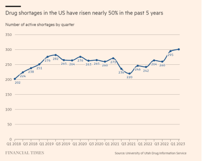 药物短缺严峻根据美国卫生系统药剂师协会的数据,截至3月底,所有治疗领域共有301种药物被列为“短缺”,这是近十年来的最高数字。