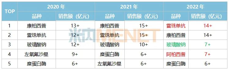 “后来者”阿柏西普于2018年获批进口,2019年进入国家医保谈判目录后销售额立即突破1亿元,2020-2022年增速分别为106.52%、59.40%、18.69%,排名在2022年升至TOP4品种。