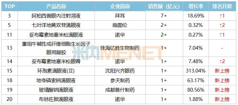 表3:2022年眼科用药TOP20品牌中销售额为正增长的品牌
