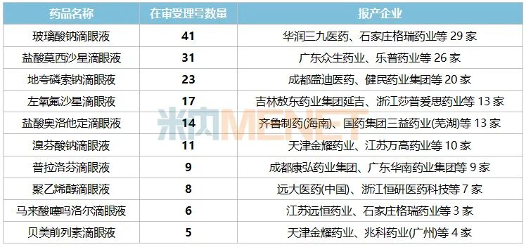 2017年至今有超过200个受理号申报仿制上市并在审评审批中,涉及产品超过30个。玻璃酸钠滴眼液、盐酸莫西沙星滴眼液和地夸磷索钠滴眼液抢仿热度十分高涨,在审的受理号涉及企业均超过20家。