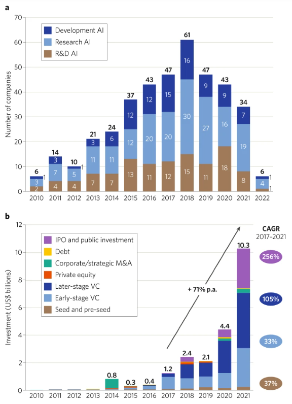 根据统计,在2010年至2022年间,约有390间AI驱动生物科技公司创立,其中有近半(~47%)仅专注于药物发现研究(Research),约四分之一(~26%)专注于药物开发(Development),另有约四分之一(~27%)则同时聚焦药物研发过程(R&D)。其中在2010-2018年间,新创立公司的数量稳定成长,在2018年间有61家新成立的AI驱动生物科技公司。受新冠疫情影响之故,此数值自2019年起有所下滑。另一方面,从2017年到2021年,资本对AI领域的投入增长了10倍,复合年增长率(CAGR)为71%,而且晚期风险资本(VC)融资和首次公开募股(IPO)也在增加。例如,2021年有五家公司进行了IPO,包括Recursion公司,筹集了4.36亿美元,以及Exscientia公司,通过3.5亿美元的IPO和同时进行的1.6亿美元私人配售,共筹集了5.1亿美元。
