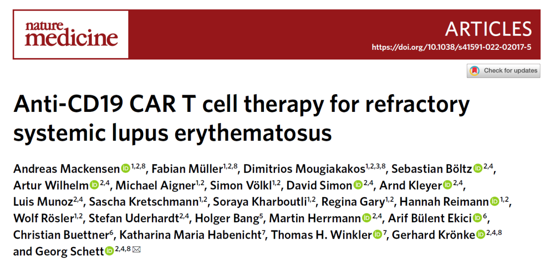 然而很多自身免疫性疾病的病因尚未得到澄清,在这种情况下,完全清除所有B细胞也可以起到抑制自身免疫反应的效果。靶向CD19的CAR-T疗法已经在治疗B细胞血液癌症的临床试验中展现出清除B细胞的卓越效力。靶向CD19的CAR-T疗法在治疗红斑狼疮等自身免疫性疾病方面也已经获得临床概念验证。去年,《自然-医学》期刊的研究结果显示,5名系统性红斑狼疮(SLE)患者在接受CAR-T细胞疗法后,实现无治疗缓解长达17个月,为治愈SLE带来了新希望。