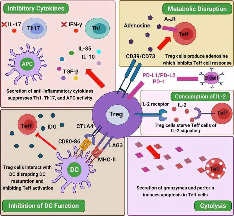 ▲调节性T细胞抑制免疫反应的多重机制(图片来源:参考资料[4])