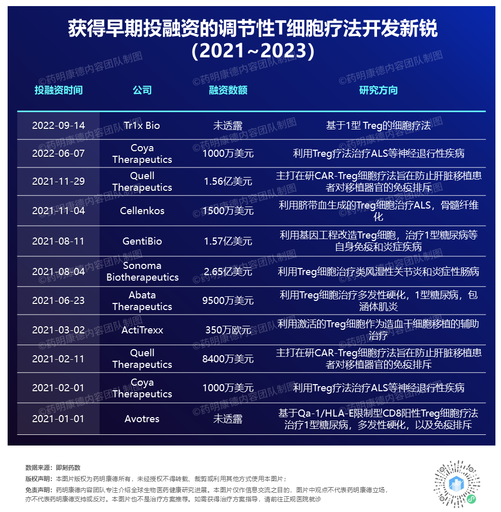 多家新锐公司也在利用Treg细胞治疗自身免疫性疾病、炎症性疾病和神经退行性疾病。根据药明康德内容团队的不完全统计,2021~2023年,至少有9家致力于开发Treg细胞疗法的新锐公司完成早期投融资。详细信息请见下表。