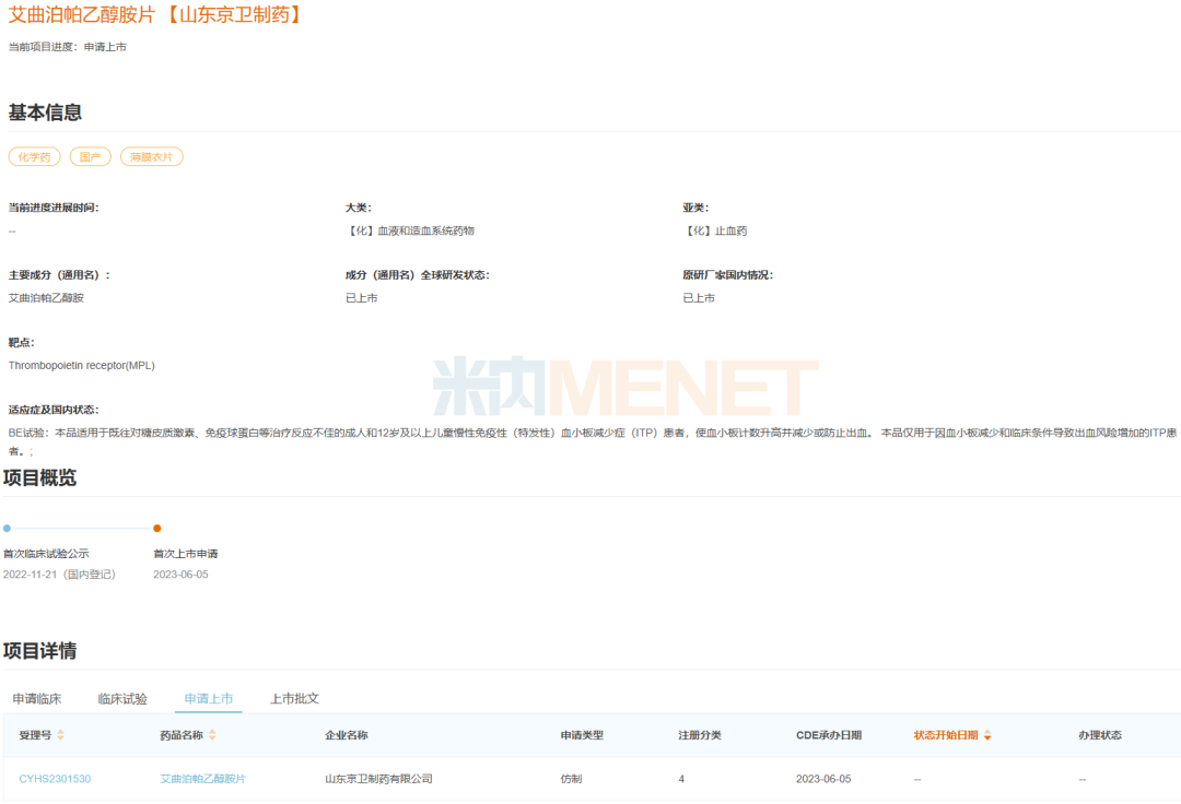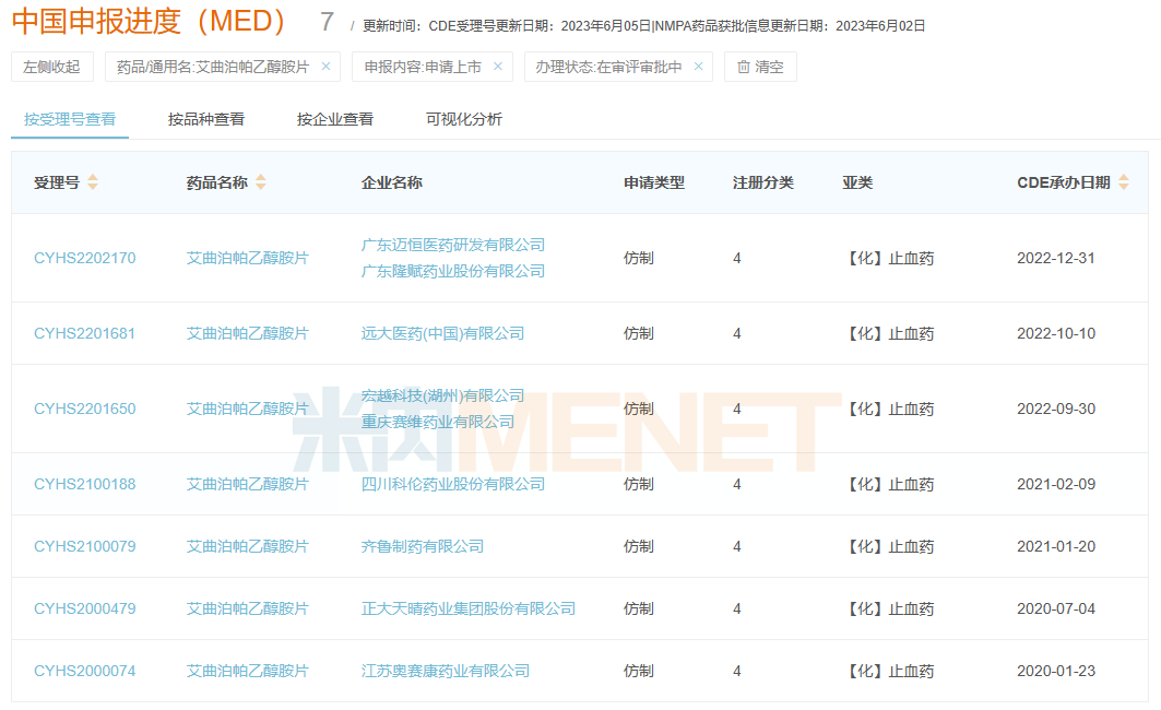 日前,CDE官网显示,山东京卫制药的艾曲泊帕乙醇胺片以仿制4类报产获受理。米内网数据显示,2022年三大终端六大市场(统计范围见文末)艾曲泊帕乙醇胺片销售额超过7亿元。目前,仅有诺华1家企业拥有生产批文,江苏奥赛康药业、正大天晴药业集团、齐鲁制药、四川科伦药业等7家企业报产在审。