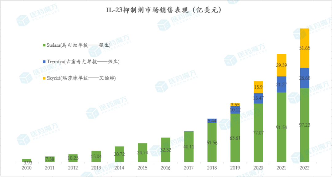 IL-23是自免领域的经典靶点,与TNF-α、IL-17A共同勾画出自免赛道的竞争版图。近年来,IL-23与IL-17抑制剂之间有些明争暗斗,但由于自免市场足够大,二者也算是和气生财。相比而言,IL-23同靶点药物之间的竞争要激烈得多,既有乌司奴单抗(强生)这样的百亿老产品树大根深,又有古塞奇尤单抗(强生)和瑞莎珠单抗(艾伯维)这样的新产品青出于蓝,另外还有mirikizumab(礼来)蓄势待发。强敌环伺之下,阿斯利康终止自己的IL-23项目也在情理之中。