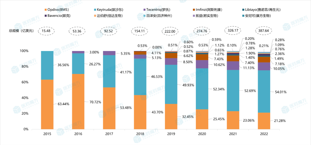 再拿商业化竞争最激烈的PD-(L)1产品来说,在2022年的387.63亿美元市场蛋糕中,K药(默沙东)、O药(BMS)、T药(罗氏)、I药(阿斯利康)4款产品以92.5%的占比近乎垄断了市场,而另外18款me too产品仅占据7.5%的份额。