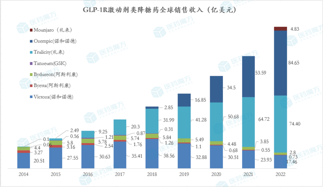 速度和效率是新药研发竞争的一个方面,会很大程度上决定市场竞争的成败。如果速度上不占优势,就需要在产品改良优化上寻找突破。GLP-1药物便是一个me better推陈出新的例证。GLP-1R激动剂并非降糖药中的新事物,但是近两年几乎成为肿瘤免疫药物之后最热门的存在,也改写了糖尿病药物市场的格局,这是得益于诺和诺德和礼来两家公司不断开发me better产品。诺和诺德在已有品种利拉鲁肽基础上,开发了新一代产品司美格鲁肽,不仅降糖减重效果显著提升,患者用药频率也从每日1次延长至每周1次;此外,在皮下注射剂型的基础上,诺和诺德进一步开发出了司美格鲁肽口服片剂。在降糖和减重两大适应症上的成功使司美格鲁肽被封为“神药”。礼来在已有产品度拉糖肽的基础上,进一步开发出了GIPR/GLP-1R双激动剂Mounjaro(替尔泊肽),这款产品同样在降糖和减重方面显现出巨大潜力。