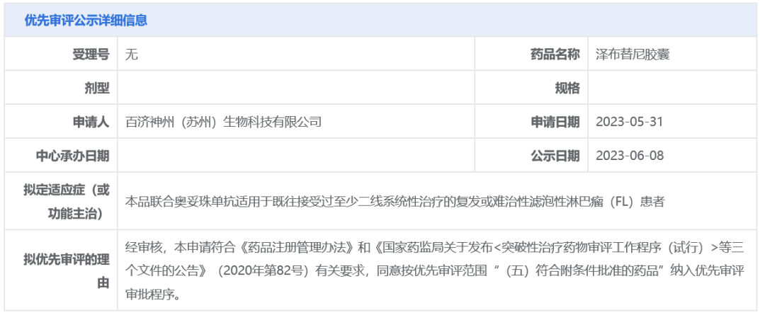 今日(6月8日),中国国家药监局药品审评中心(CDE)官网最新公示,百济神州BTK抑制剂泽布替尼拟纳入优先审评,拟定适应症为:联合奥妥珠单抗(新一代抗CD20单抗)用于既往接受过至少二线系统性治疗的复发或难治性滤泡性淋巴瘤(FL)患者。