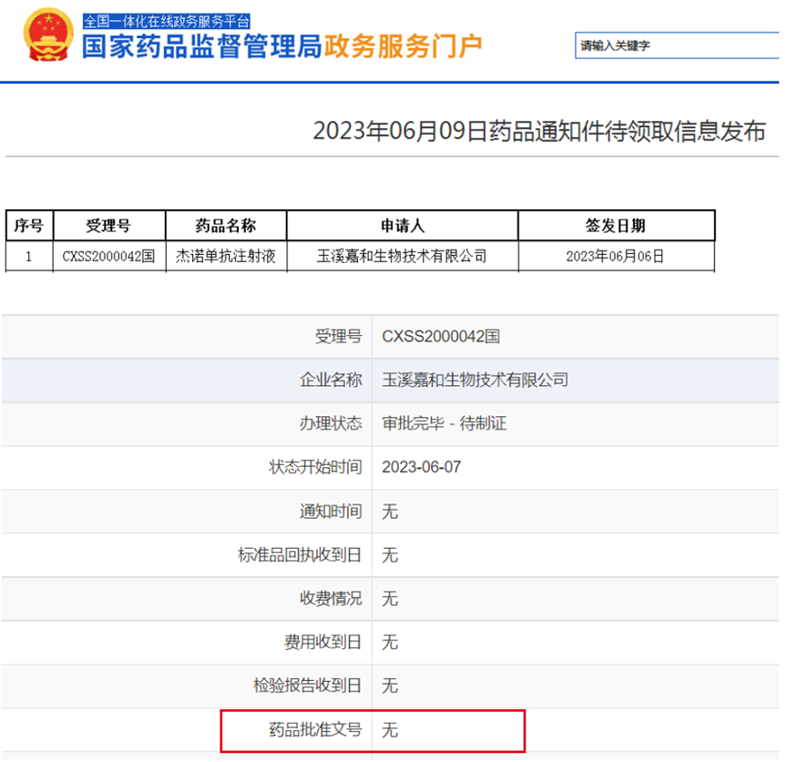 此前,国家药监局政务服务门户官网公布的《2023年06月09日药品通知件待领取信息发布》中,嘉和生物的PD-1产品杰诺单抗注射液就在其中。