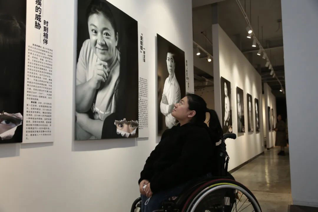 一位“瓷娃娃”患者在“关注”罕见病主题摄影展上看到自己的肖像。(来源|病痛挑战基金会)