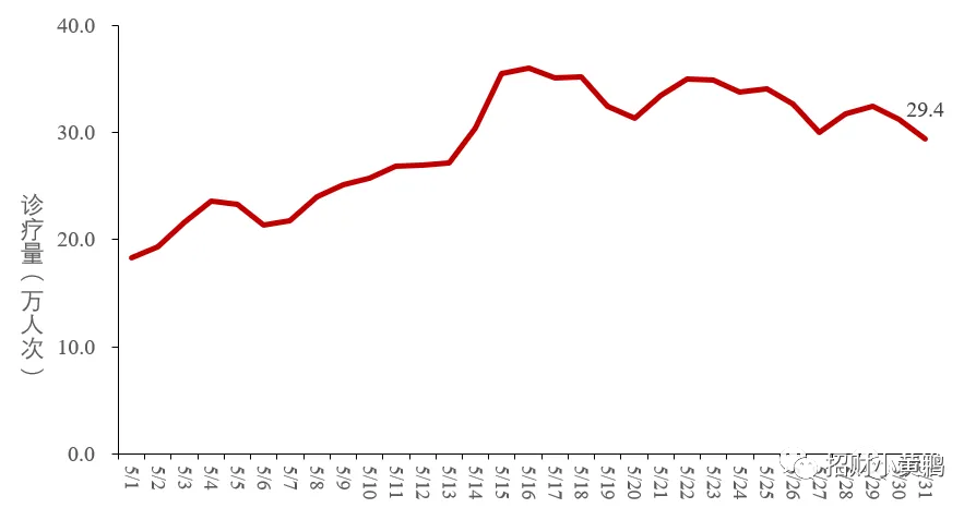 全国31个省(自治区、直辖市)及新疆生产建设兵团发热门诊(诊室)诊疗量从2023年5月1日的18.3万上升至5月16日的36.0万,之后波动下降至5月31日的29.4万。见图2。