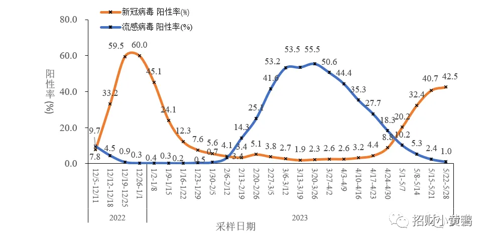图3-2 全国哨点医院流感样病例新冠和流感病毒阳性率变化趋势