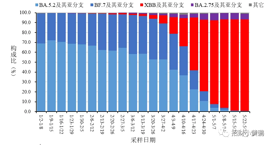 根据采样日期, XBB及其亚分支的占比逐渐增加,从5月1日-5月7日的84.6%,增长到5月22日-5月28日的92.4%。见图4。