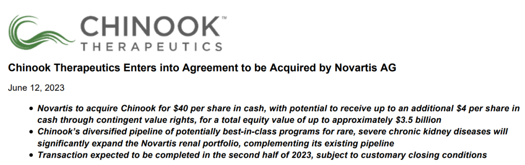 根据双方董事会一致批准的协议,诺华将以高达35亿美元的总价值收购Chinook,交易形式为Chinook和新成立的诺华子公司的合并。根据合并协议的条款,Chinook普通股持有人将在交割时获得32亿美元(每股40.00美元)的现金,外加价值高达3亿美元的或有价值权(每股4.00美元),在实现某些监管里程碑时以现金支付。该交易预计将于2023年下半年完成,但须遵守惯例的交割条件,包括Chinook股东的批准和监管部门的批准。在交易完成之前,Chinook将继续作为一家独立的公司运营。
