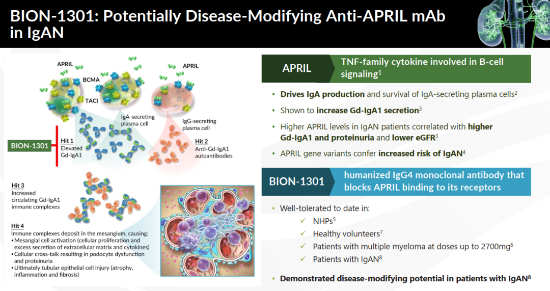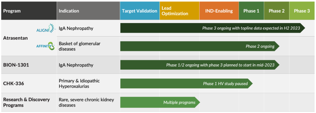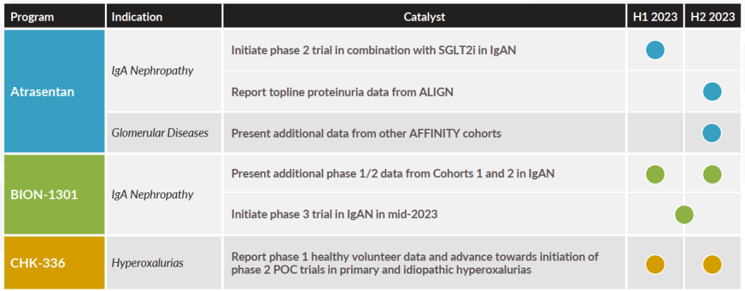 Atrasentan是一种口服内皮素A受体拮抗剂(ERA),目前正处于IgAN的3期临床阶段,预计将于2023年第四季度进行关键读数,其蛋白尿显著减少。Atrasentan还处于其他罕见肾脏疾病的早期开发阶段。Zigakibart(BION-1301)是一种皮下给药的抗APRIL单克隆抗体;IgAN的3期试验预计将于2023年第三季度开始。Chinook在肾脏疾病建模和理解方面拥有深厚的专业知识,并有望早期解决一些严重的肾脏疾病。