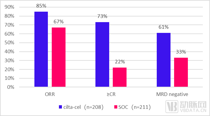 主要研究终点PFS方面,在中位随访期为15.9个月的情况下,cilta-cel组和标准治疗组的12个月无进展生存率分别为76%和49%(HR 0.26;P < .0001)。在次要终点中,cilta-cel组ORR为85%,73%的患者达到CR或更好,总体的微小残留病(MRD)阴性率达到61%。而标准治疗组的患者中,ORR为67%,22%的患者达到CR或更好,MRD阴性率为33%。