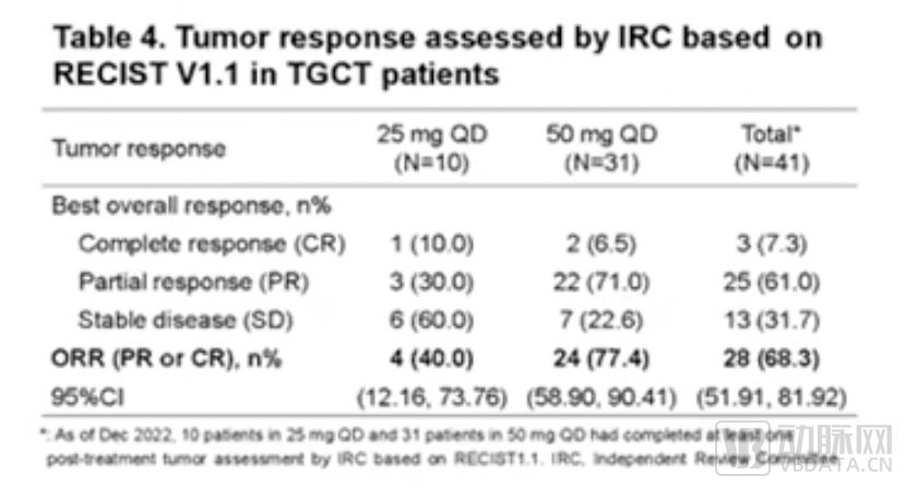 共计31例接受50mg QD剂量Pimicotinib治疗的患者完成了至少1次经治疗后的肿瘤缓解评估,所有患者均观察到了肿瘤的缩小,且未达到中位缓解持续时间(DOR)。ORR高达77.4% (24/31),包括2例完全缓解(CR)的患者和22例部分缓解(PR)的患者。而在这24例获得客观缓解的患者中,87.5% (21/24) 患者的客观缓解在接受治疗后的25周内就被观察到。