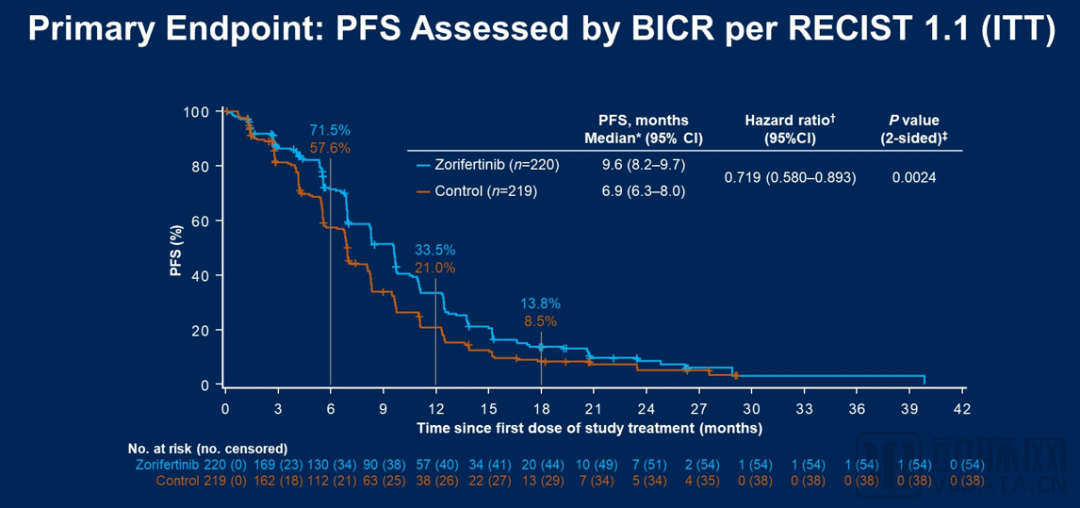 数据截止时,两组的中位随访时间均为20.4个月。研究主要终点为盲态独立中心评估(BICR)的PFS:与对照组的6.9个月相比,Zorifertinib组的中位PFS为9.6个月,明显更优。次要疗效终点上,BICR/研究者评估两组的中位IC PFS分别为15.2个月与8.3个月,以及17.9个月与11.1个月。