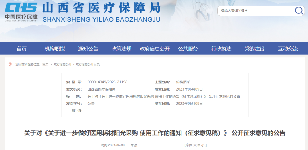 除了广西明确将药械集采平台切换迁移至国家统一招采管理子系统外,同一天(6月9日),山西省医保局也发布《关于进一步做好医用耗材阳光采购使用工作的通知(征求意见稿)》。