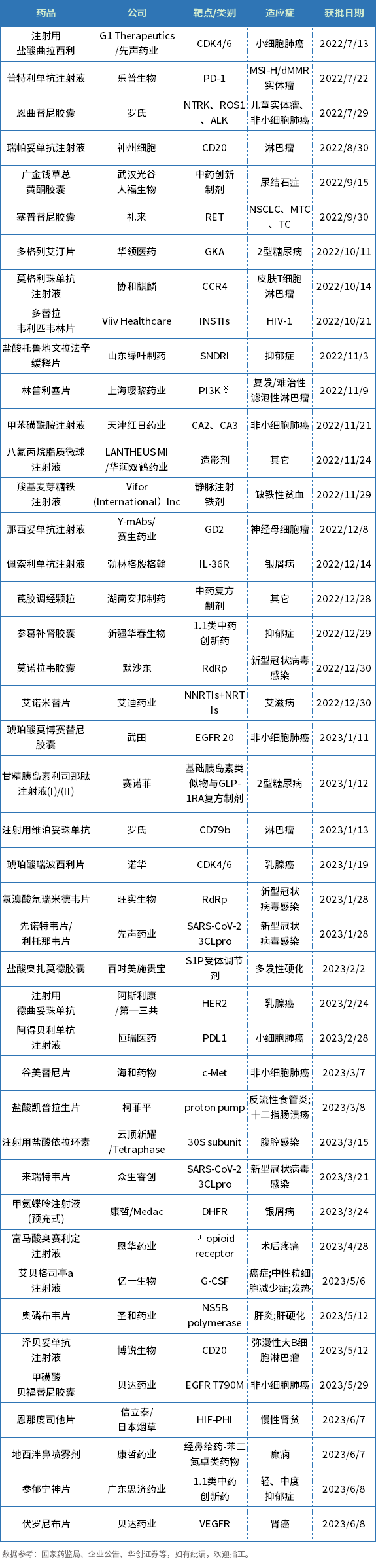 据不完全统计,自2022年7月始至今年6月初,已有超40款新药获批上市有望参与到下一轮医保谈判中,涉及到的国外企业有罗氏、礼来、BI、默沙东、武田、赛诺菲、诺华、BMS/阿斯利康/第一三共等;国内企业如有恒瑞、君实生物子公司旺实生物、乐普生物、先声药业、信立泰、贝达药业、亿帆医药子公司亿一生物、康哲药业等。其中不乏有PD-(L)1、ADC、EGFR 20、CD20抗体等明星药物,看点十足。