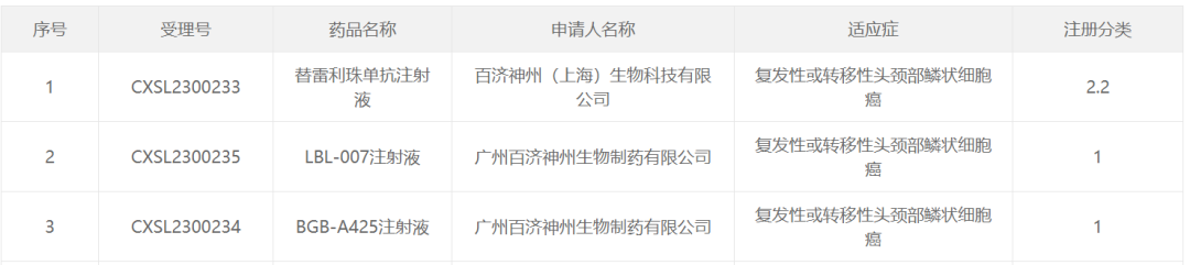 中国国家药监局药品审评中心(CDE)官网最新公示,百济神州申报的3款新药获得临床试验默示许可,分别为:抗TIM-3抗体BGB-A425注射液、抗LAG-3抗体LBL-007注射液以及抗PD-1单抗替雷利珠单抗。这3款新药获批临床的适应症均为:复发性或转移性头颈部鳞状细胞癌。