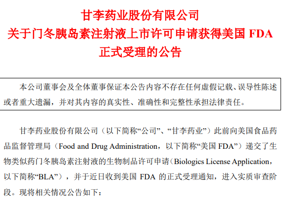 6月14日,甘李药业公告FDA正式受理其递交的门冬胰岛素注射液的BLA。