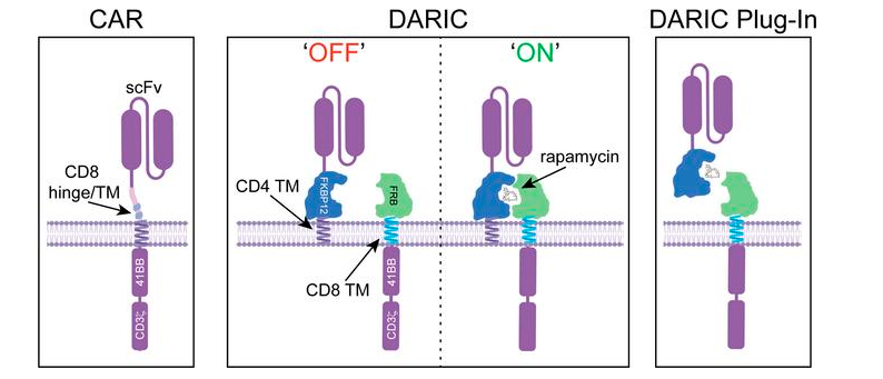 这种设计实现了使用雷帕霉素在开和关状态之间轻松切换,DARIC T还细胞可以在长期停药后重新激活。