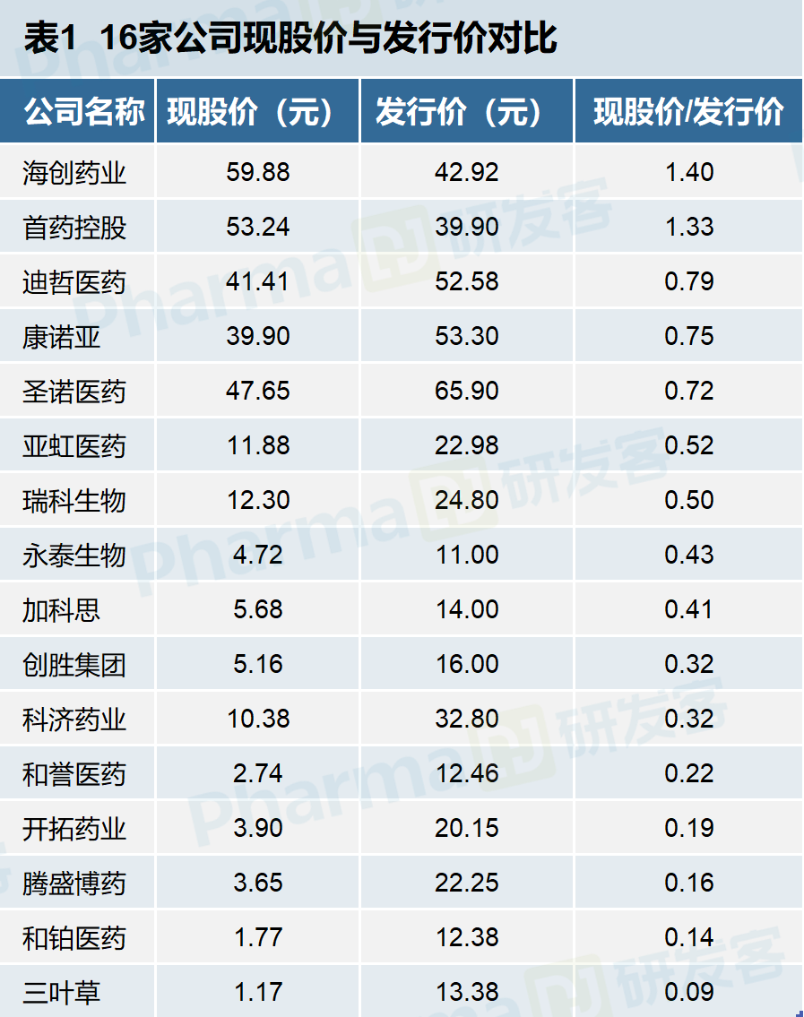 尤其是18A和A股科创板里那些暂无产品获批的未盈利公司(见表1,以下简称“16家公司”),多数当前市值远低于IPO市值,仅海创药业和首药控股两家公司例外(见下表)。且不少公司的下跌颓势自2022年来一直延续,今年上半年股价也无明显起色。其中近2/3(10家)公司的市值已跌破发行价的一半。